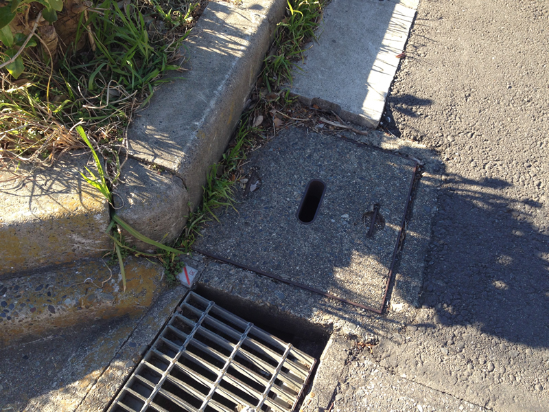 下水管が集まっている側溝の石の下で鳴いているではないか。
